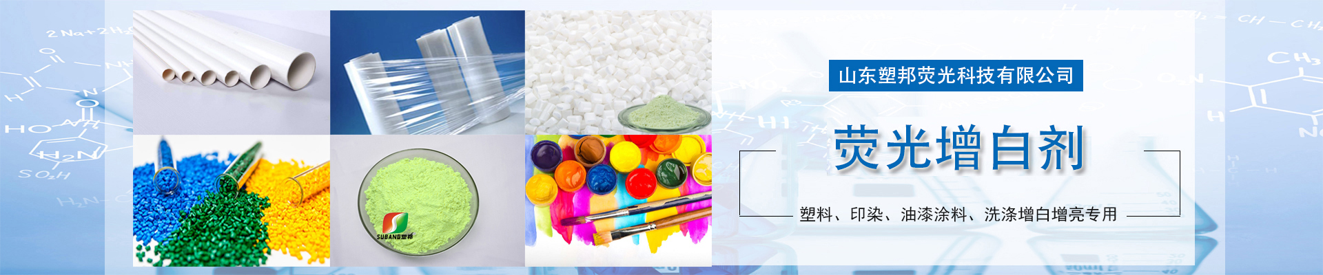 可根據(jù)白度要求選擇加入量,以下為參考用量: 1、聚氯乙烯(PVC): 增白:0.01~0.05%(10-50g/100kg物料) 透明:0.0001~0.001%(0.1-1g/100kg物料) 2、聚苯(PS): 增白:0.001%(1g/100kg物料) 透明:0.0001~0.001%(0.1-1g/100kg物料) 3、ABS: 0.01~0.05%(10-50g/100kg物料) 其他塑料:對(duì)于其他熱塑性塑料、醋酸纖維、聚甲基丙烯甲酯(PMMA)、聚酯滌綸切片也有很好的增白效果。