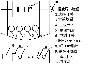 b. 用溫度計測出被測液的溫度后,將“溫度”鈕置于被測液的實際溫度相應位置上。當“溫度”鈕置于25℃位置時,則無補償作用。